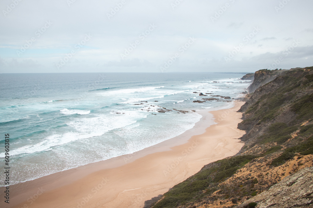 Famous Praia da Carreagem beach in the southwest of Portugal, near the town of Aljezur in the Odemira region. The waves of the Atlantic Ocean crash on the sand. Wandering the Fisherman Trail