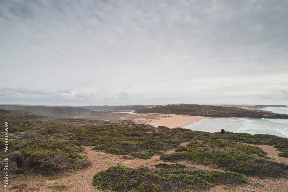 Portuguese landscape of endless plains and sandy beaches along the rocky cliffs of the Odemira region. Wandering along the Fisherman Trail