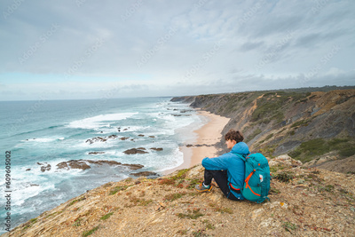 Young man sits above the famous Praia da Carreagem beach in southwest Portugal, near the town of Aljezur in the Odemira region. Wandering along the Fisherman Trail