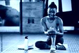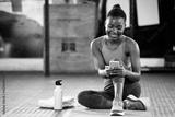 Smartphone, happy or black woman in gym on social media to relax on fitness or exercise or workout break. Athlete, meme or funny girl with mobile app for online digital communication after training