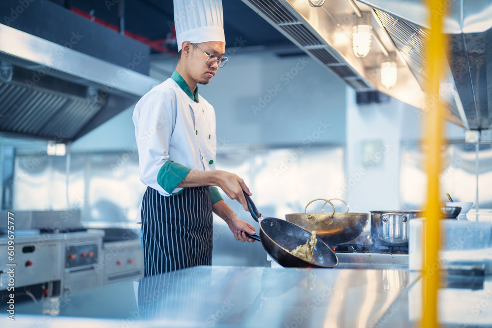 Chef in restaurant kitchen at stove and pan cooking flambe on food