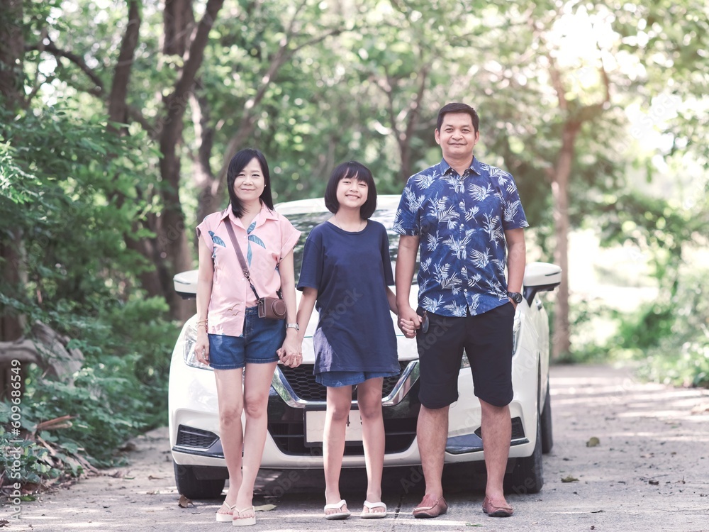 Cheerful asian family father, mother and daughter standing near car, enjoy journey together outdoor in summer. Family trip, vacation and travel at auto