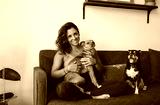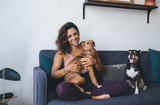 Portrait of cheerful female enjoying leisure time with lovely purebred dogs having fun at comfortable home sofa, Caucasian woman laughing at camera during weekend time with cute mongler doggie