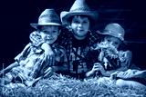 Three laughing children on hay in a hangar