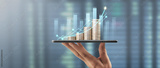 Hand holding smartphone device and touching screen. Stock exchange market concept. looking