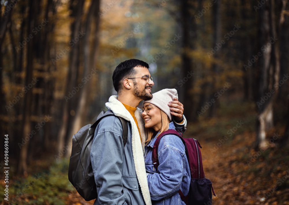 Couple spending time together walking on forest road on photographing each other a foggy morning.