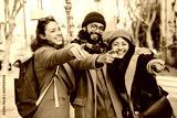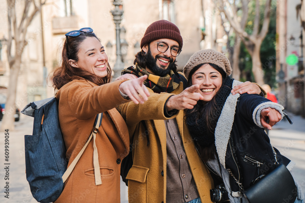 A group of happy tourist friends walking and pointing the direction sightseeing on a city. Three young travelers smiling together walking with backpacks and having fun visiting Spain. Journey trip