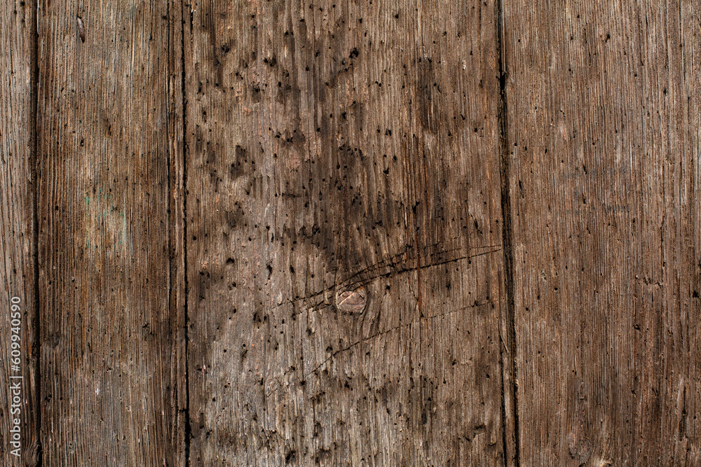 Dark wooden background natural texture with scratches and cracks, destroyed by wood boring insects.
