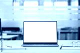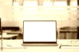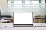 Laptop device mock up template design on office workplace desk, white mockup empty blank computer screen on office work table business web technology at modern workspace, closeup.