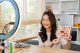 Beautiful women with social media influences are teaching makeup and use cosmetics, In front of the camera to recording vlog video live streaming, Online business on concept of beauty bloggers.