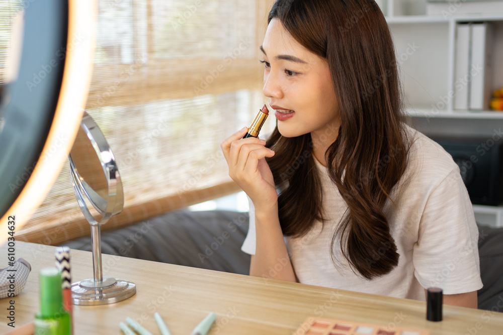 Beautiful women with social media influences are teaching makeup and use cosmetics, In front of the camera to recording vlog video live streaming, Online business on concept of beauty bloggers.