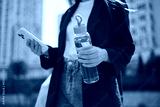 Young girl holding a glass bottle of water and a modern smart phone in hands. Unrecognizable female person walking in the city street with a gadget and a reusable water bottle