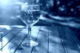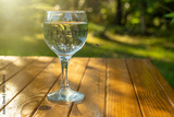 A glass of clean drinking water stands on a wooden table against the background of a green forest.Clean water in nature.