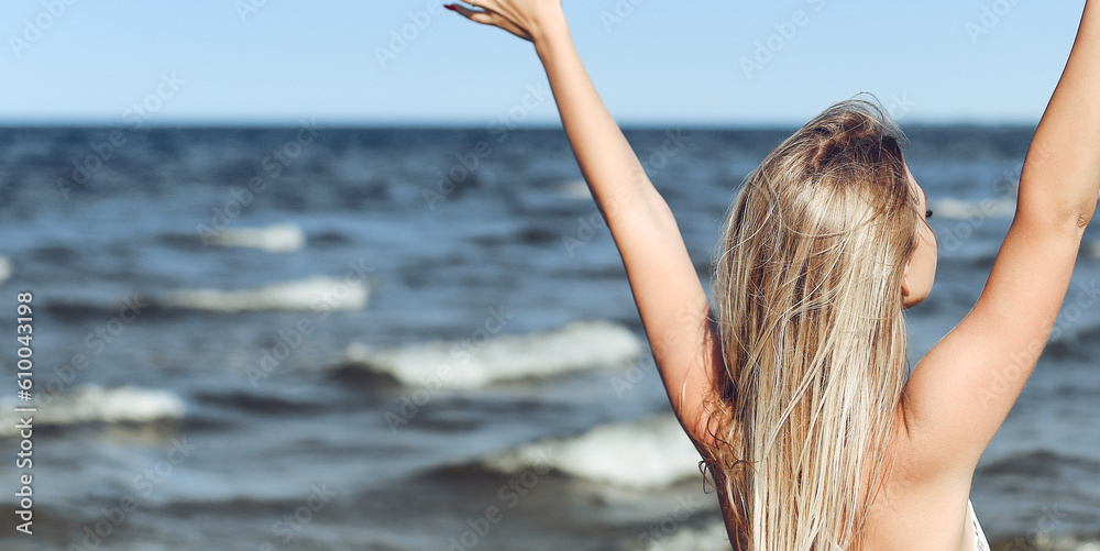 Happy blonde beautiful woman on the ocean beach standing in a white summer dress, raising hands.