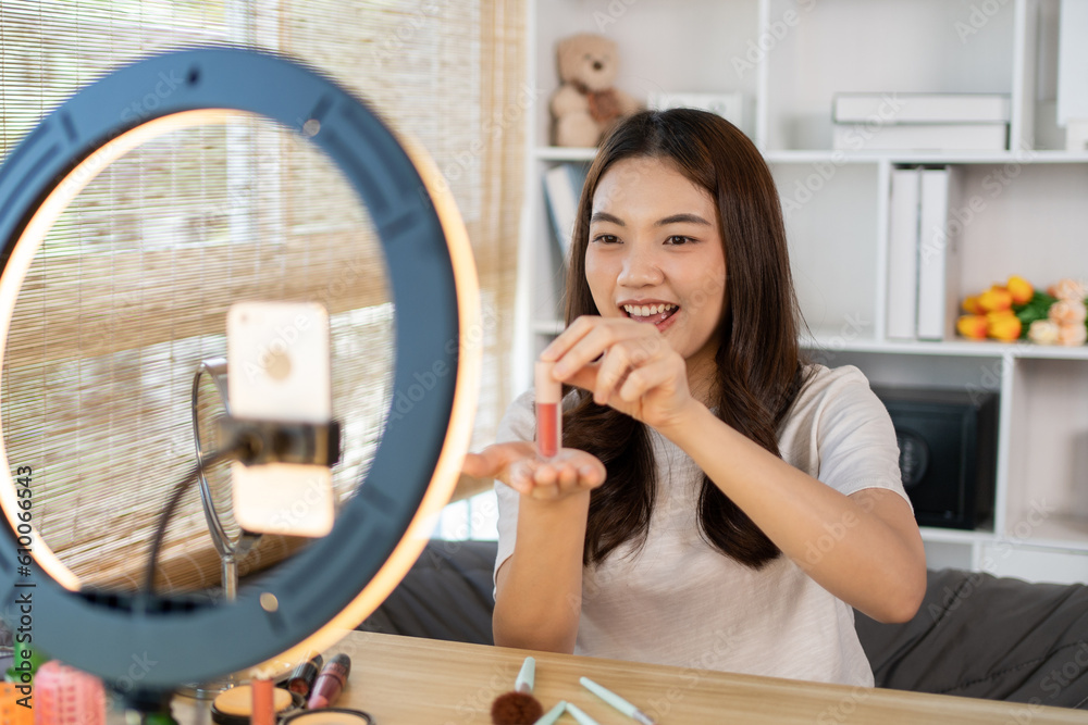 Beautiful women with social media influences recommend products and make-up accessories to be more beautiful, Recording vlog video live streaming, Online business of beauty bloggers.