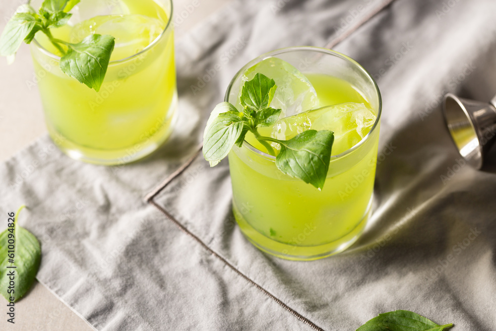 Gin Basil Smash Cocktail refreshment gin, fresh lemon juice, syrup and basil leaves