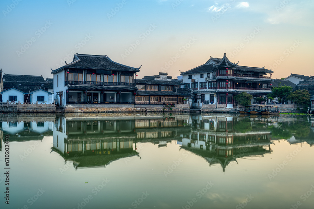 landscape with Chinese ancient town, wooden houses and smooth lake in sunrise