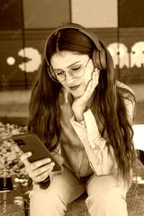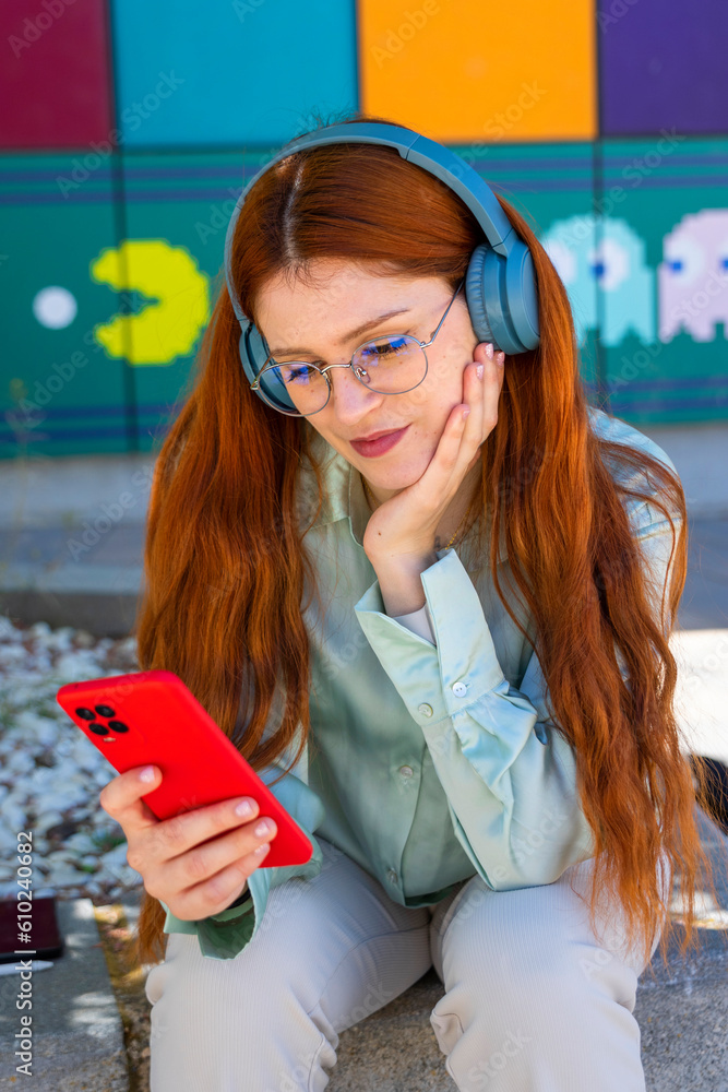 Redhead Girl. Melodic Bliss: Charming Redhead Captivated by Music with Vibrant Mobile Phone