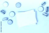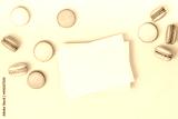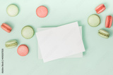 Flat lay composition with empty letterhead, envelopes and multicolored macaroons on light turquoise background.Sweet greeting card.Invitation.