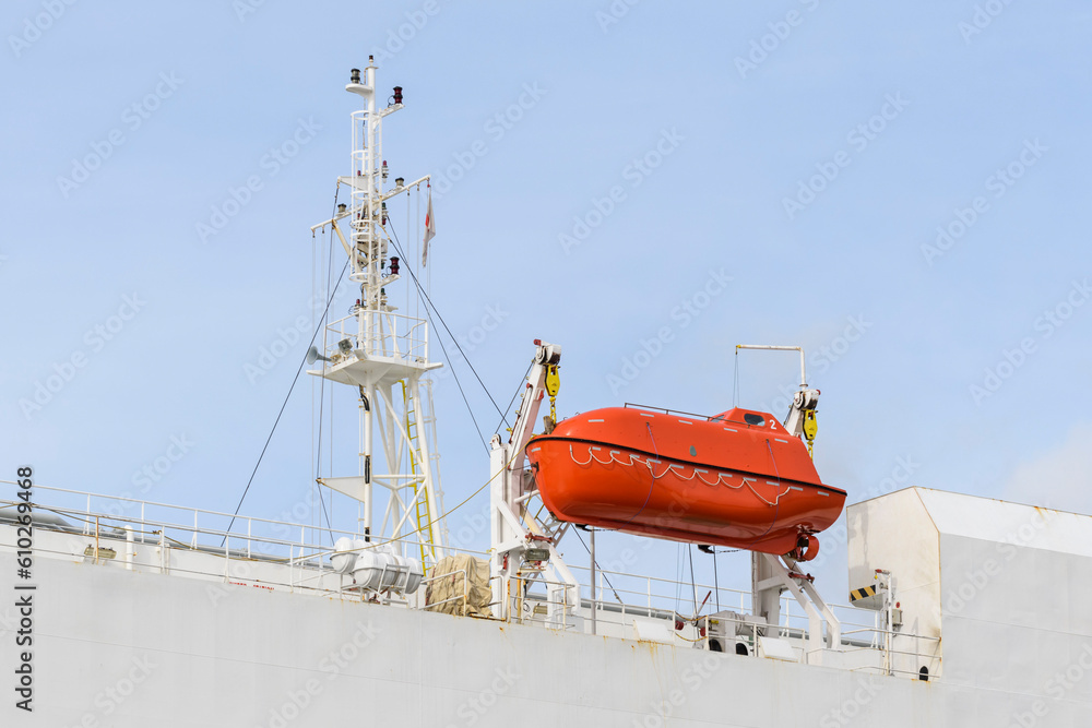 Lifeboat on big cargo vessel. Lowering orange lifeboat to water. Abandon ship drill. Lifeboat training. Man over board drill. Lifeboat training.
