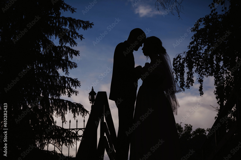 silhouette of embracing couple of bride and groom on a wedding day in nature
