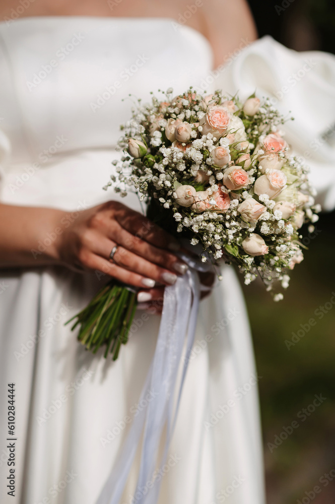 wedding bouquet of white roses in the hands of the bride on the wedding day