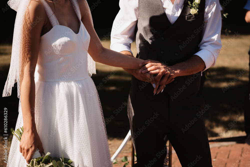 hands of the bride and groom hold together on the wedding day during the festive ceremony