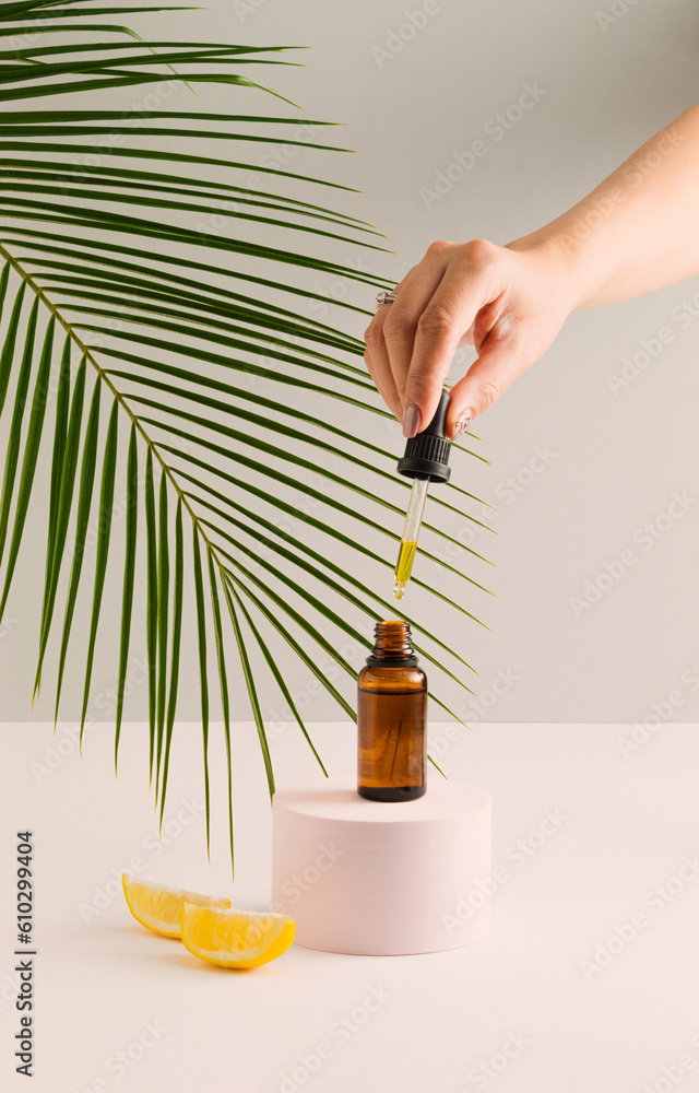 Cosmetic serum Vitamin C in brown glass bottle with pipette dropper. Woman's hand and a slice of lemon. Tropical palm leaf. Beauty concept. Natural skin care cosmetics. Suitable for Product Display.