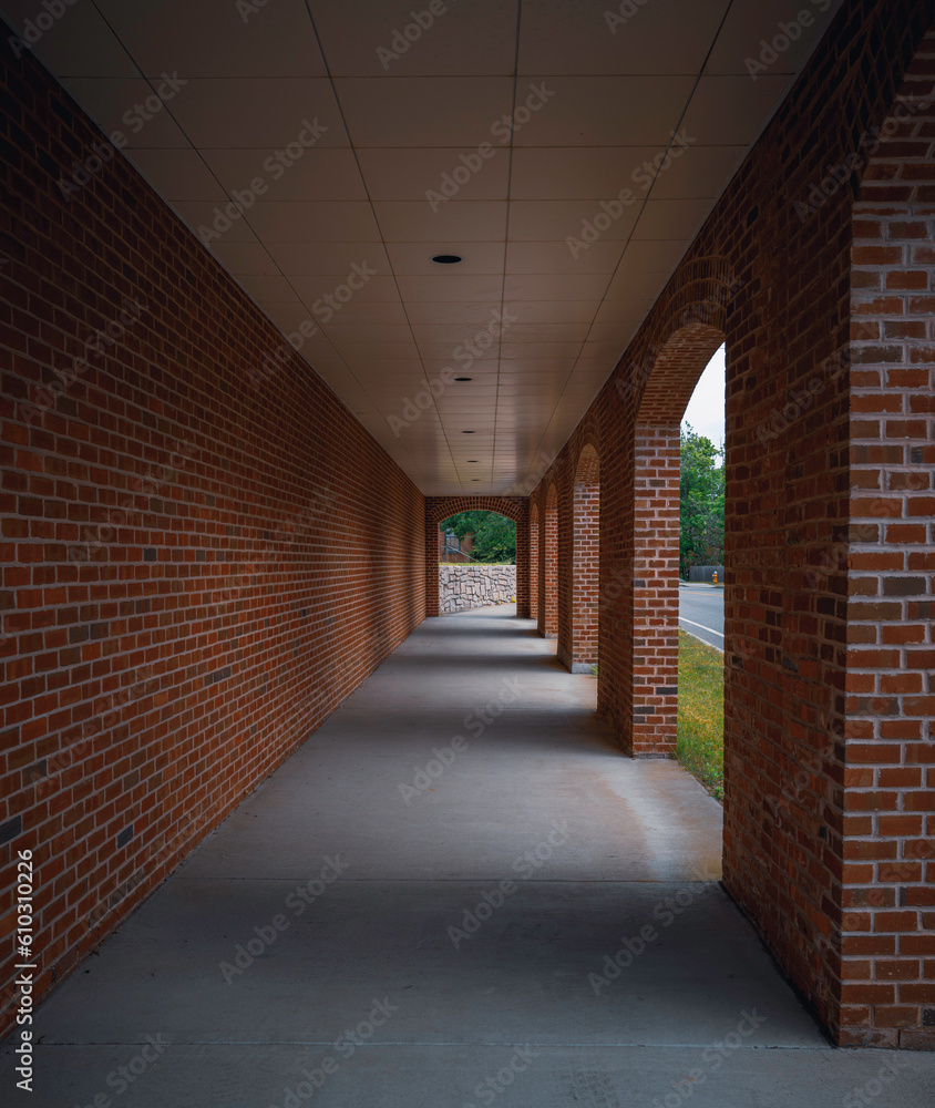 Corridor of the building. Architectural red brick columns, diminished perspective of the walkway in an old building