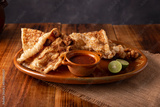 Chicharron. Crispy Fried pork rind, are pieces of aired and fried pork skin, traditional Mexican ingredient or snack served with lime juice and red hot sauce.