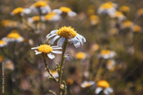 White daisies waving in the wind view from above. Wild medicinal chamomiles in bloom in a summer meadow, lawn. Flowers and nature, wild flowers, herbs. Floral seasonal blossom in spring garden.