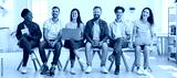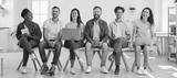 DIverse team of happy modern corporate company workers having fun at work. Group of joyful mixed race multiethnic people in T shirts and jeans with laptops and notebooks sitting in office and laughing