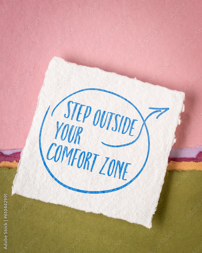 step outside your comfort zone concept, handwriting and sketch on an art paper, personal development concept