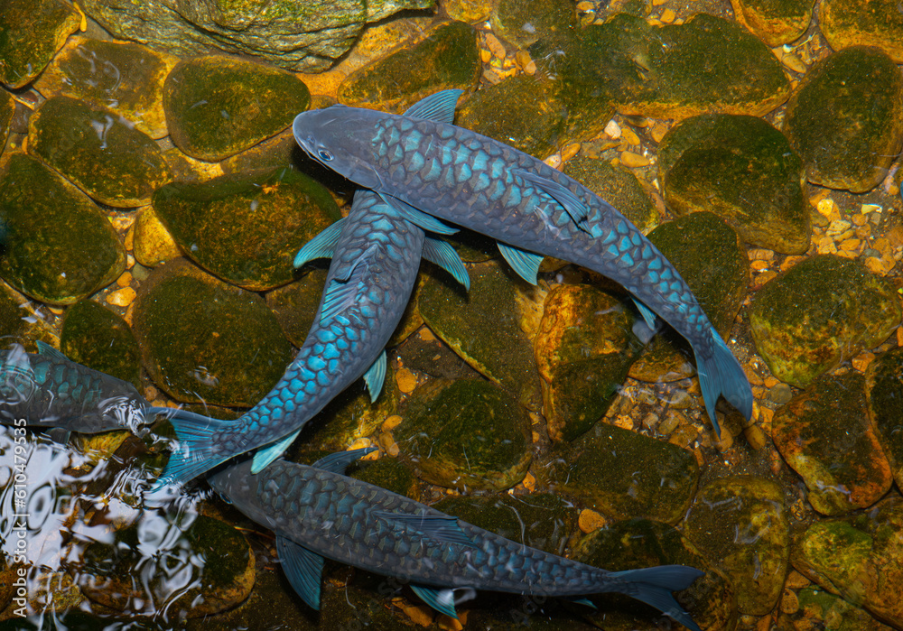 Schools of black fish have blue glassy scales. Swim in a pebble-bottomed pond with clear, clean water that is the nature of aquatic animals.