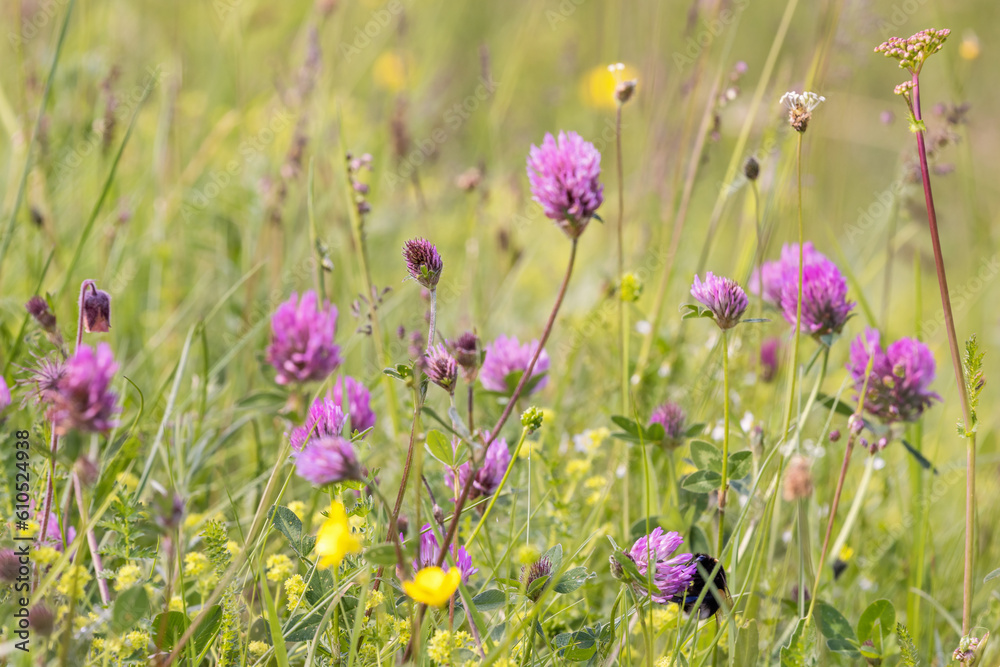 Meadow with flowering Red clover flowers and a bumblebee