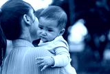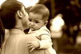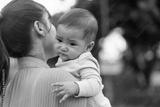 mother holding and comforting her crying infant baby outside in park with sunlight