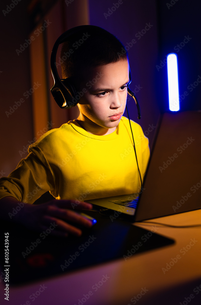 Young boy gamer with headphone playing video game on laptop at home.