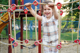 Little cute girl with curly hair playing on the children's playground in public park on a warm summer day, entertainment and recreation for children