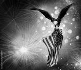 Eagle With American Flag Flies In The Fireworks With Bokeh Lights - Independence Day