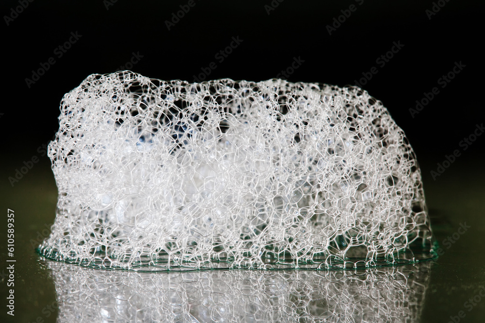 Soap foam close-up. thousands of shampoo suds bubbles at macro zoom, black background. selective focus