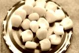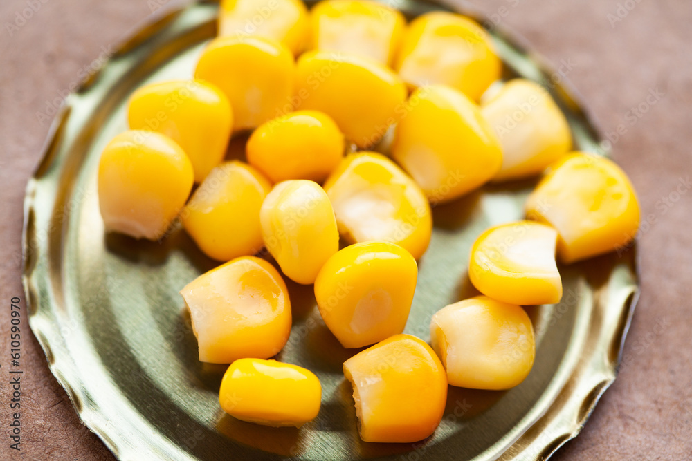Sweet corn on the lid of a can. food preservation concept. macro view. vintage paper background