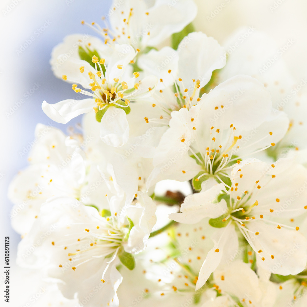 A branch of an apple tree with blooming flowers with white petals and yellow stamens. close-up macro