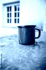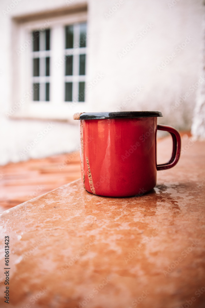 A red cup with freshly brewed coffee, cappuccino, chocolate, cocoa. A metal mug on a window sill against orange brown tiled roof. Drinking a hot beverage in a morning. A break for relaxation.