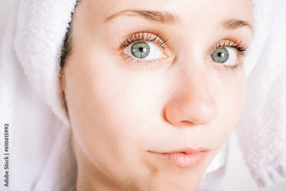 A beautiful white girl, young woman with blue eyes and white bath towel over her head is looking into camera Everyday routine, self-care and youthfulness concept. Natural feminine beauty. Serious look
