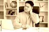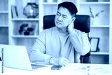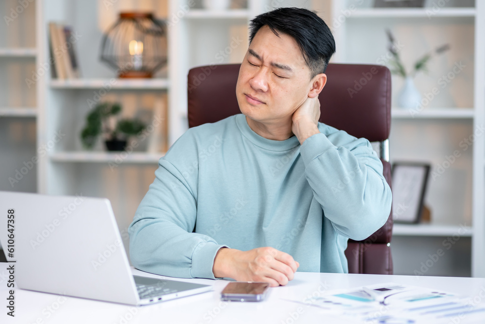 Young frustrated asian freelancer is having a strong pain in neck. He is at home office, sitting at his modern work station, suffering, massaging it