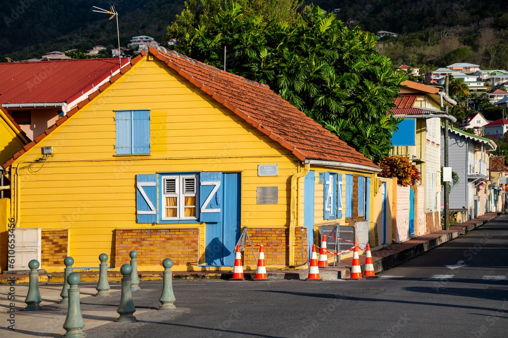 Street view panorama of picturesque creole village “Les Anses-d'Arlet“ with colorful wooden houses and tropical vegetation. Idyllic popular holiday destination on caribbean island Martinique, France.