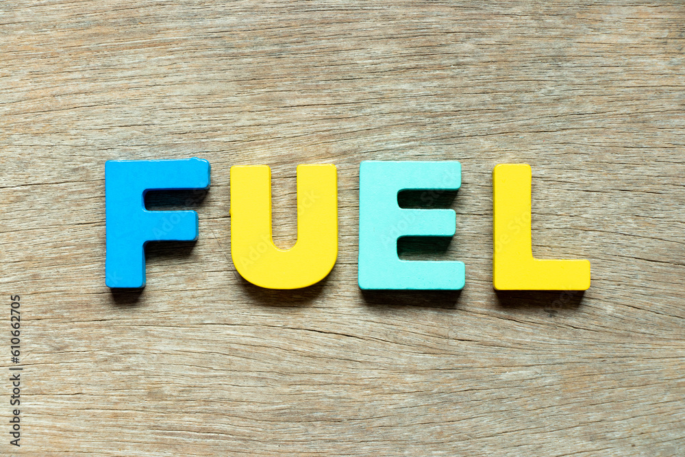 Color alphabet letter in word fuel on wood background