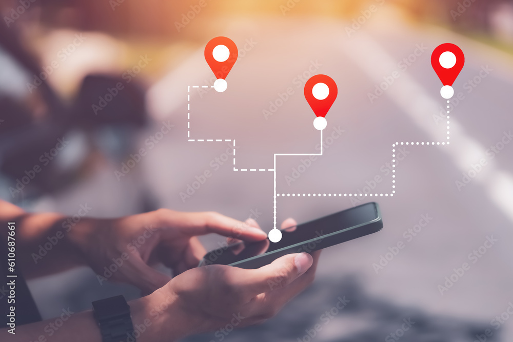 Man hand using smartphone with gps navigator map icon on blur street background. Technology lifestyle and business travel concept. Vintage effect color style.