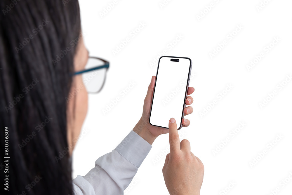 Woman holding smartphone with transparent screen and background. Above shoulder view. App presentation mockup