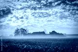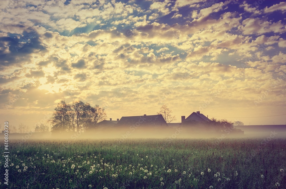 Spring rural landscape. Old houses and morning fog in the meadow with clouds and sun in the background.